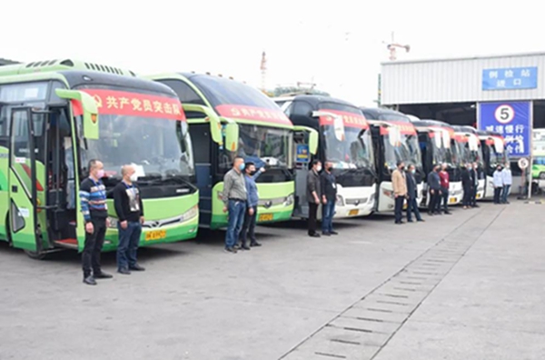 2月25日下午,7輛張貼著“共產(chǎn)黨員突擊隊”橫幅的大巴車緩緩駛出麗水客運(yùn)東站,前往貴州六盤水、銅仁,安徽滁州,湖南懷化、邵陽等地接運(yùn)民工返崗。由中國好司機(jī)、省級勞模章雙林帶隊,7名黨員和一部分入黨積極分子組成的黨員突擊隊參加,共計14名駕駛?cè)藛T出征。其中12名駕駛?cè)藛T為百萬公里以上安全駕駛員。