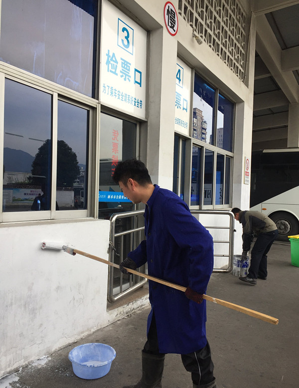 由于車站人流量大,候車廳、過道等地方的墻壁特別容易變臟。為了節(jié)省人工成本,江書記便買來了涂料,發(fā)動(dòng)黨員志愿者們利用休息時(shí)間對(duì)墻壁進(jìn)行刷白。