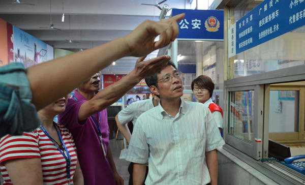 在客運(yùn)西站,陳部長(zhǎng)一行察看了售票大廳、候車室前廳等地方??吹绞燮贝髲d內(nèi)文明旅游引導(dǎo)員正在引導(dǎo)旅客有序排隊(duì)購票,文明旅游公益宣傳提示牌擺放整齊,兩處文明旅游標(biāo)語均按規(guī)定陳列醒目時(shí),陳部長(zhǎng)對(duì)西站的工作也給予了充分肯定。在進(jìn)一步了解情況后,陳部長(zhǎng)對(duì)身邊的運(yùn)管部門負(fù)責(zé)人說:“西站的問題不在站內(nèi),主要在出租車管理和黑車的打擊,運(yùn)管部門要做好管理工作?!彪S后與各部門負(fù)責(zé)人一起商議了出站口出租車管理措施、硬件改造等問題。